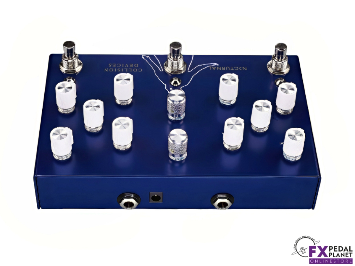The Nocturnal is a handmade multi effect pedal by Collision Devices, designed for creating immersive soundscapes and textured ambiences. Perfect for guitar, bass, synthesizer, or any instrument that plugs in, it merges a modulated delay, dynamic tremolo, and shimmering reverb into one powerful unit. Crafted in France, the Collision Devices Nocturnal is built with precision, from its robust metal enclosure to its intricate circuitry, all assembled by hand.