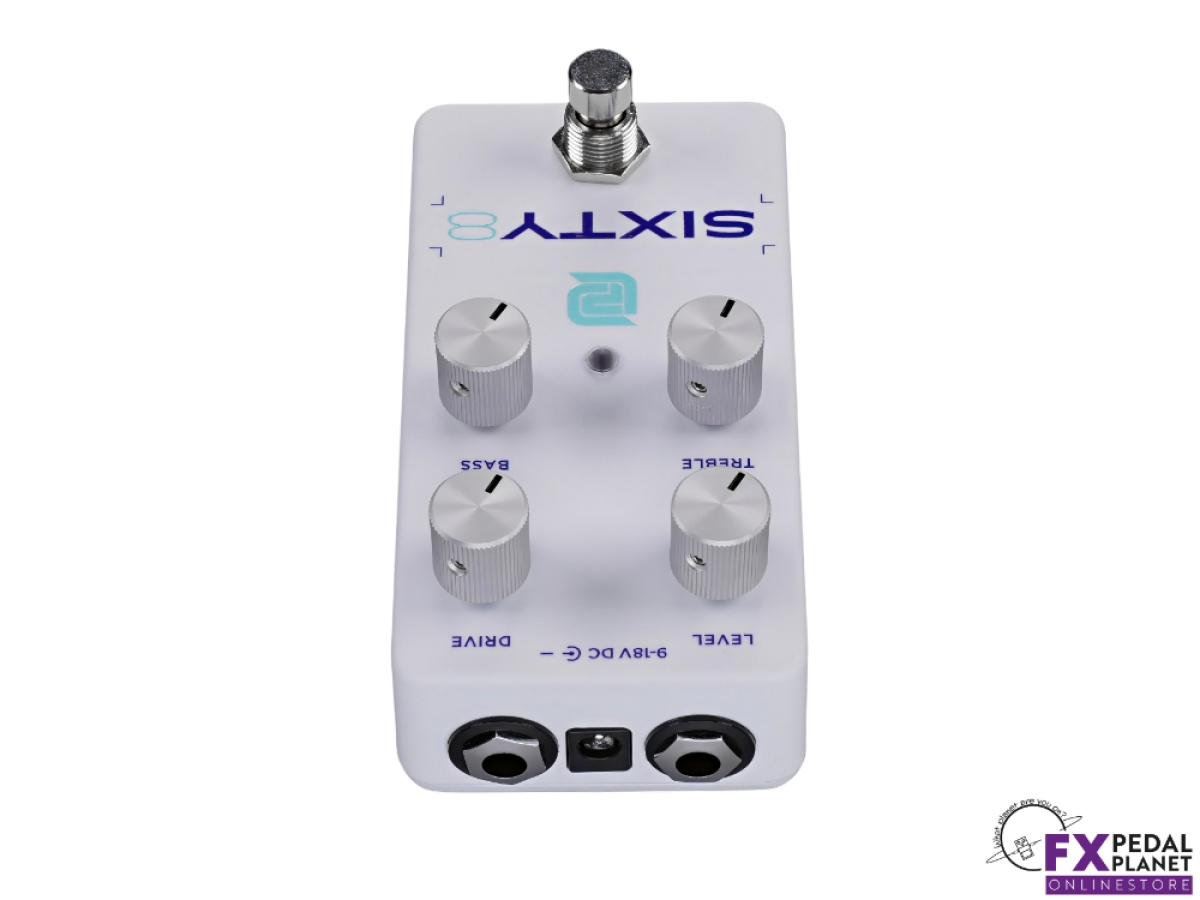 The LPD Pedals Sixty8’s enclosure is made from cast aluminium for strength and durability, finished in Oxford White with a refined textured surface and distinctive artwork that stands out on any pedalboard. The layout is clean and intuitive, with top mounted input, output, and DC jacks for straightforward cable routing and better use of pedalboard space. The soft touch footswitch is custom designed for quiet, reliable operation, and the bright LED indicator makes it easy to see the LPD Pedals Sixty8’s status, even on dark stages.