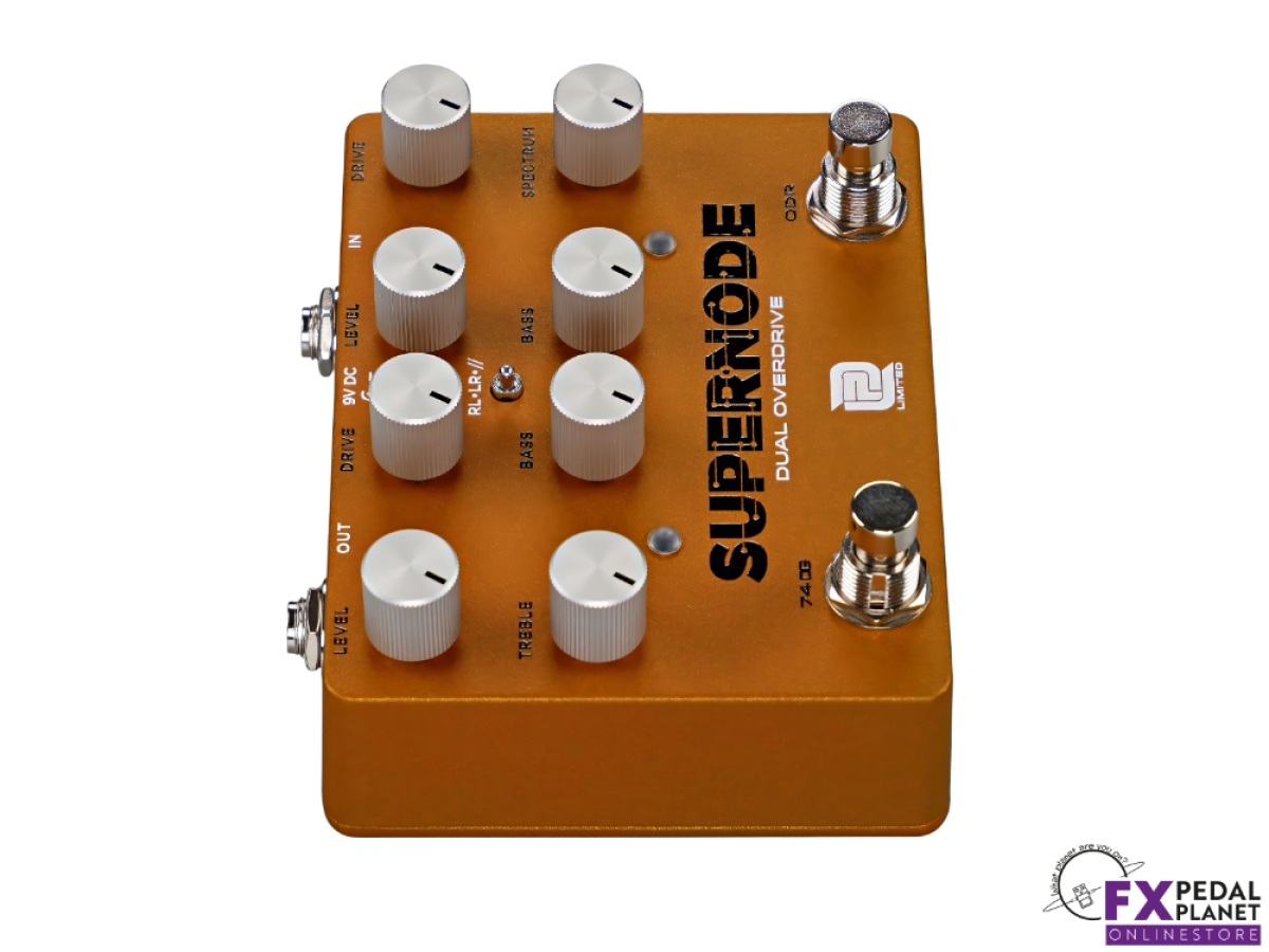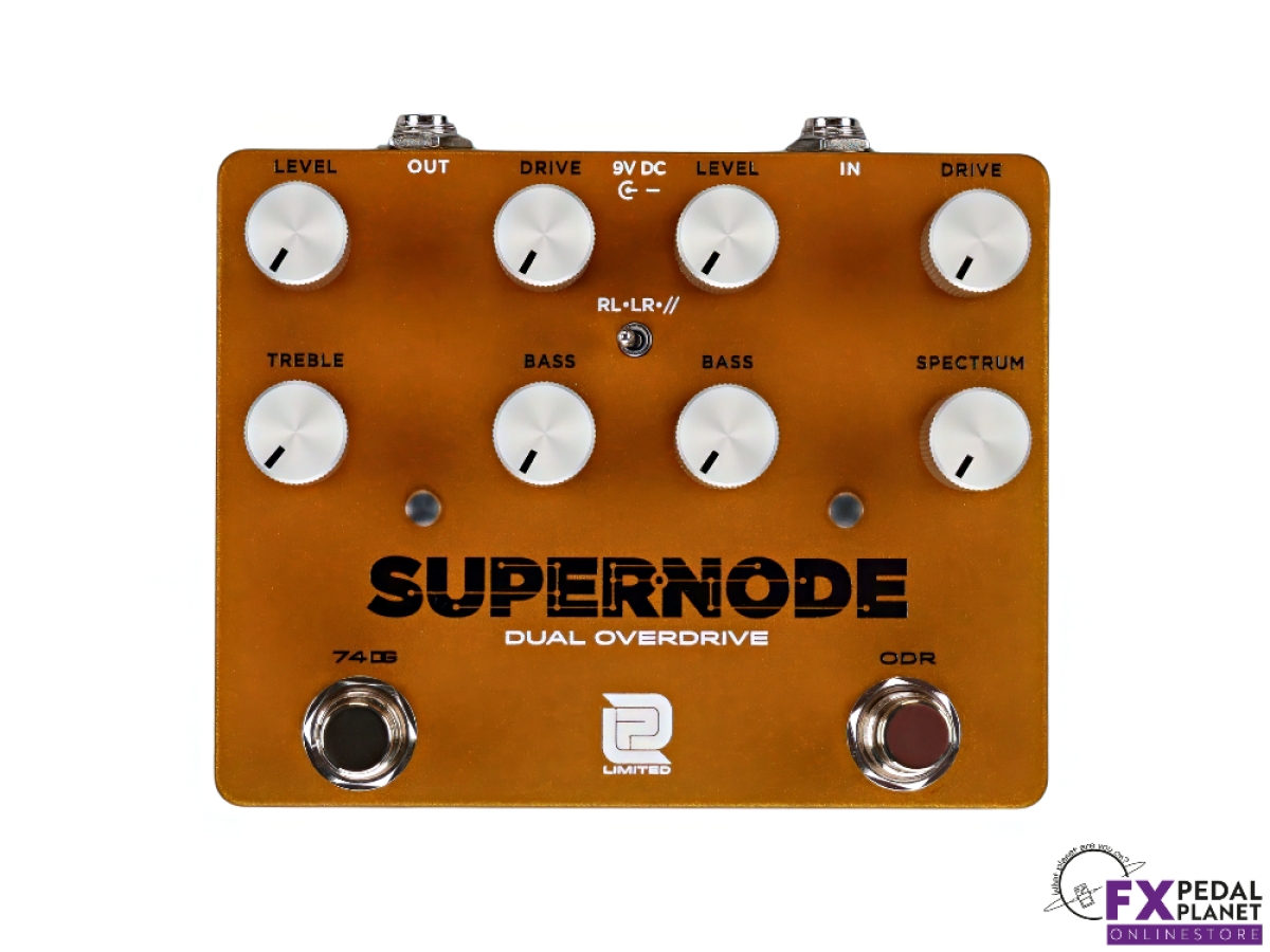 The LPD Pedals Supernode is an all-analogue dual overdrive built as a flexible drive section for a working pedalboard, giving guitarists and bass players two distinct gain voices that can be used alone, stacked, or blended to suit anything from cleanish rhythm work to pushed leads. Its left and right layout keeps each circuit clear and quick to operate on stage, while the order/parallel selector and programmable switching make it equally comfortable in a simple rig or a more involved board where gain staging needs to change song by song.