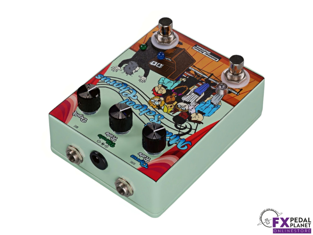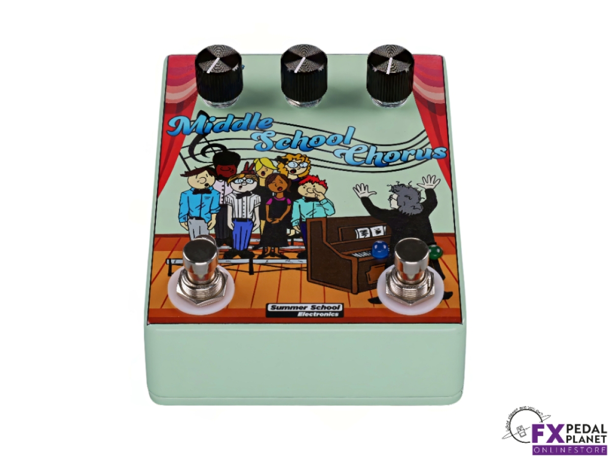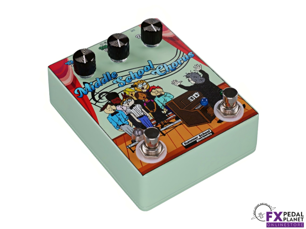 Summer School Electronics Middle School Chorus is a compact analogue modulation pedal designed by educator musician Mark Turley in Syracuse, NY. It delivers warm, lush chorus tones alongside a dedicated vibrato mode, all in a single stompbox powered by a standard 9 volt negative centre power supply.