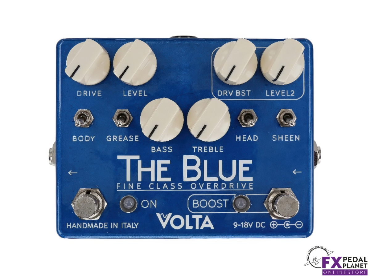 Equipped with comprehensive controls, The Blue by Volta Custom lets players fine tune each aspect of their sound. Its two band EQ offers flexible bass and treble adjustments that can be set flat for a neutral tone or dialed in for warmth and clarity. Additionally, the BODY, GREASE, HEAD, and SHEEN controls provide unique tonal enhancements—BODY adds body and compression, GREASE fattens the tone, HEAD adjusts the gain character from warm to modern, and SHEEN boosts upper harmonics for added brilliance.